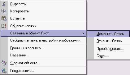 Редактирование связи с помощью контекстного меню Контекстное меню связанного объекта содержит команды для управления связанным объектом. Щелкните правой клавишей мыши на связанном объекте для того, чтобы открыть его контекстное меню, и выберите необходимые действия для изменения связи (рис. 123).