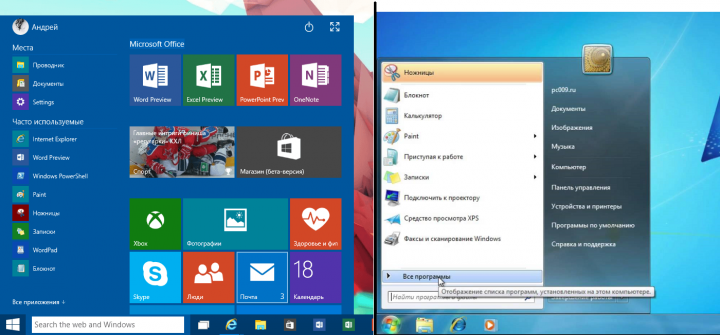 | Меню «Пуск» | Меню «Пуск», которое включает в себя список установленных приложений и строку поиска | Комбинированное меню «Пуск», которое включает и список приложений, и Windows Live Tiles |