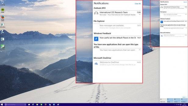 This is one of our favorite changes to the Windows platform. While Windows 8.1 does an OK job at providing some notifications-such as a birthday reminder or Facebook message-they’re somewhat ephemeral. Windows 10 slides out a notification card at the bottom of the screen; if you miss it, you can still access it by clicking the Notifications icon that sits to the system clock. This displays the Notifications panel that is normally tucked away to the right of the screen.