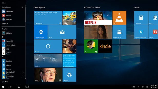 There are six components to the Start Menu: File Explorer, Documents, Settings, Most Used (Apps), the Power button, and the All Apps button. This latter button will pull up every installed app, whether it’s from Windows Store or installed manually by the user. The Live Tile view of the Start Menu can be expanded full-screen, mimicking the Start Screen seen in Windows 8/8.1.