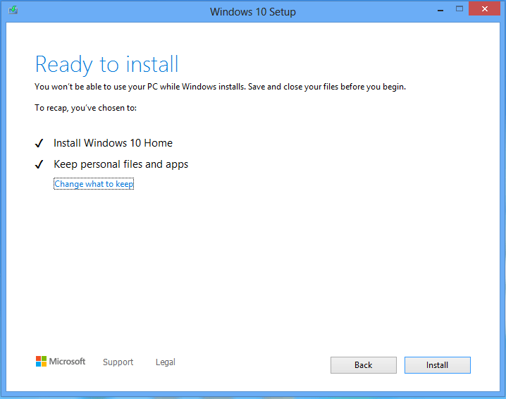Step 6: It time to install Windows 10. Just decide what to keep, for example, keep personal files and apps. And click Install.