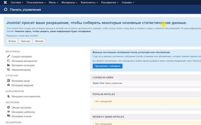 Благодаря своей популярности на большинстве хостингов CMS разворачивается в один клик. Но для добавления шаблонов и плагинов приходится сначала загружать их на компьютер, а затем заливать на сервер через «Менеджер расширений», что немного не удобно. Однако к этому быстро привыкаешь.