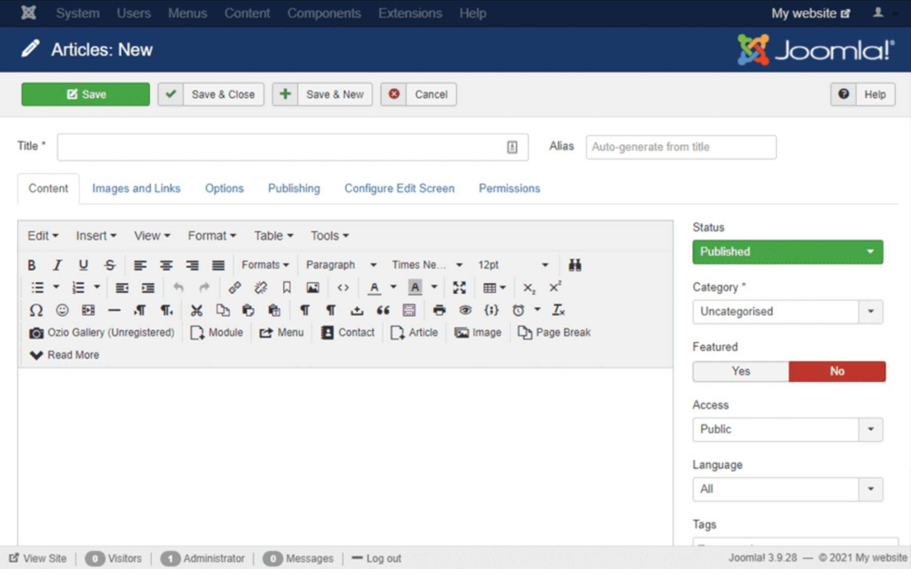 In Joomla, creating content is technically as easy as it is in WordPress. The publishing editor Joomla uses is TinyMCE, which is the same editor that WordPress used until version 5.0. So anyone with familiarity there (or with other WYSIWYG editors) will feel right at home.
