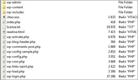 Разработчики WordPerss максимально упростили файловую систему, сделали её понятной. Например в корневом каталоге найдете несколько файлов и три папки: