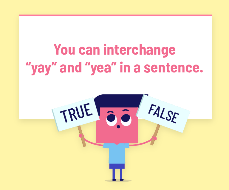 Unlike yeah and yes, yay is an interjection. Meaning, it’s a word used to convey emotion. People use this term to express joy, enthusiasm, or triumph. On the other hand, writers often use yay to emphasize elation, pleasure, and approval in writing.