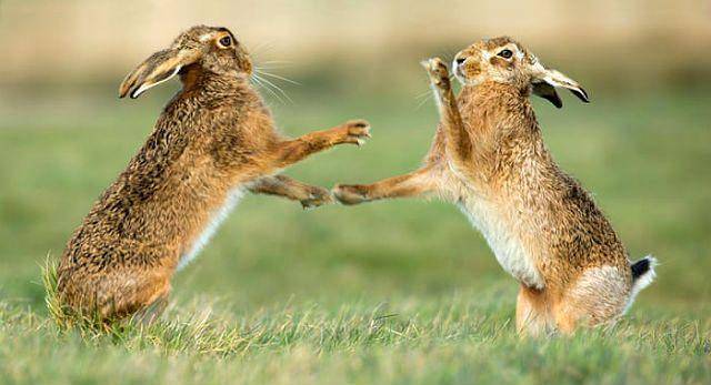 Когда самка русака принимает позу для спаривания, самый сильный самец покрывает ее, остальные прыгают, стараясь сбить самца лапами.