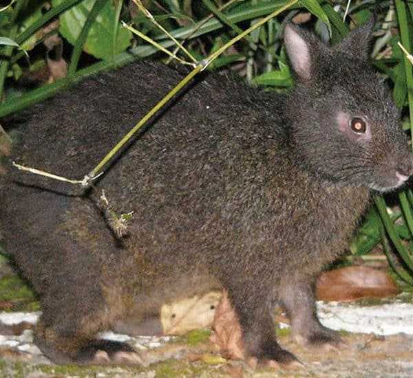 - Древесный заяц из Японии легко взбирается на дерево, чтобы полакомиться молодыми листьями, побегами, спрятаться или отдохнуть в дупле. На типичных зайцев он не похож – шерсть у него темная, глаза и уши маленькие, длина хвоста всего 2 см, задние лапы короткие. Когти загнутые, что и позволяет карабкаться по стволу дерева. Прыгать он не может, зато способен передвигаться короткими перебежками. На поиски пропитания отправляется с наступлением ночи.