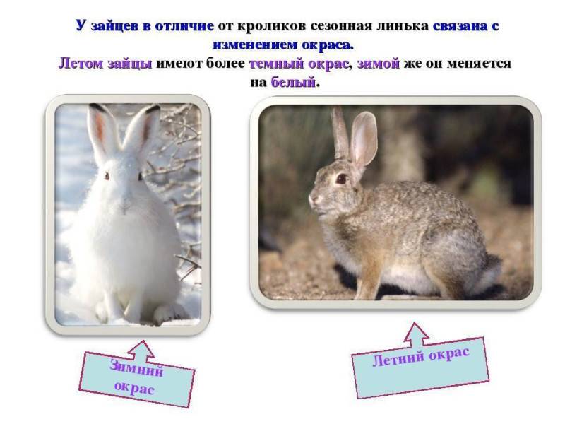- для кролика нехарактерна смена окраски шубки, а заяц, как известно, с приходом зимы облачается в белоснежную шерстку, что позволяет ему прятаться от хищников;
