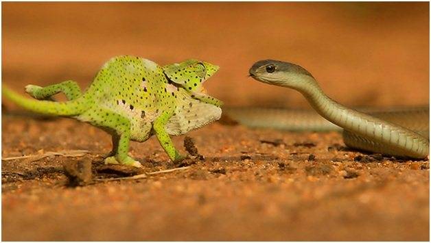 Приспособлением к наземному образу жизни являются различные способы защиты от врагов. Например, функцию защиты у черепах выполняет панцирь. Хамелеон для устрашения врагов с шипением раздувает свое тело, а еще может менять свою окраску.