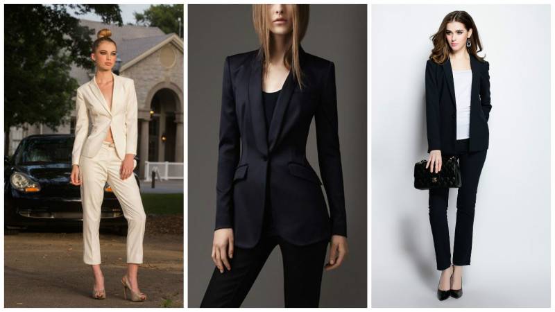 Смокинг — нарядный вариант пиджака с атласными лацканами. Данный вариант также изначально считался мужским, но девушки не могли не оценить такую красоту. К тому же, он был необходим для курения. Атласные вставки нужны были для того, чтобы пепел не оседал на одежде. Смокинг перешел в женскую моду в середине двадцатого века благодаря Ив Сену Лорану.