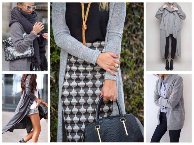 Модниц интересует, с чем носить серый кардиган так же часто, как и бордовый. Это классические цвета, которые часто используются для верхней одежды, например, для пальто. Серый более универсальный, он подходит практически ко всему. Его носят как с такими же спокойными оттенками, так и с более яркими. Примеры можно увидеть на фото.