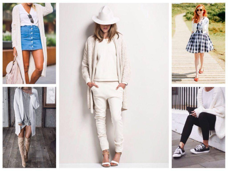 Также легко найти решение, с чем носить белый кардиган, с капюшоном или без. Он не менее универсальный, чем черный, но смотрится более свежо и ярко, это хорошо заметно на фото. Не стоит отказываться от классики: привычному сочетанию, белая блузка и темные брюки или юбка, он придаст новую мягкую нотку. Украсит он и серое платье футляр.