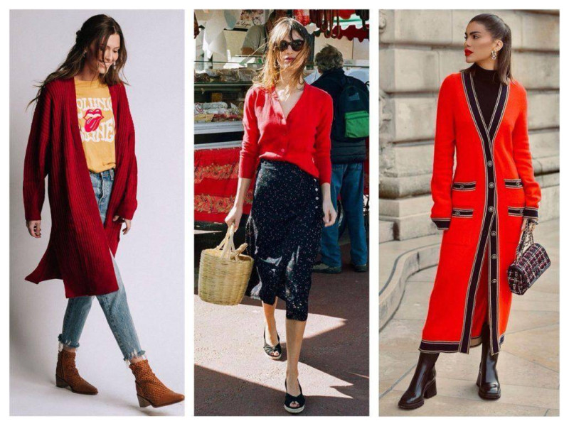 Для создания яркого и вызывающего образа следует выбрать красный цвет. Он никогда не выходит из моды. Интересно в таком цвете будет смотреться объемный, укороченный кардиган без пуговиц. Сочетать его можно с джинсами или юбками миди. Сам по себе кардиган красного цвета является акцентной вещью, поэтому остальная одежда в образе должна быть сдержанной.