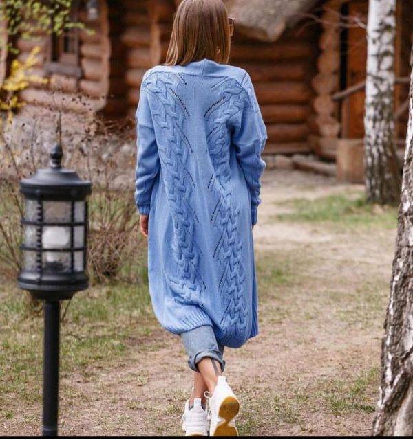 - жакет-кардиган имеет прямой, удлинённый фасон без воротника и лацканов. Такая вещь идеально подойдёт для тёплой весенней погоды;