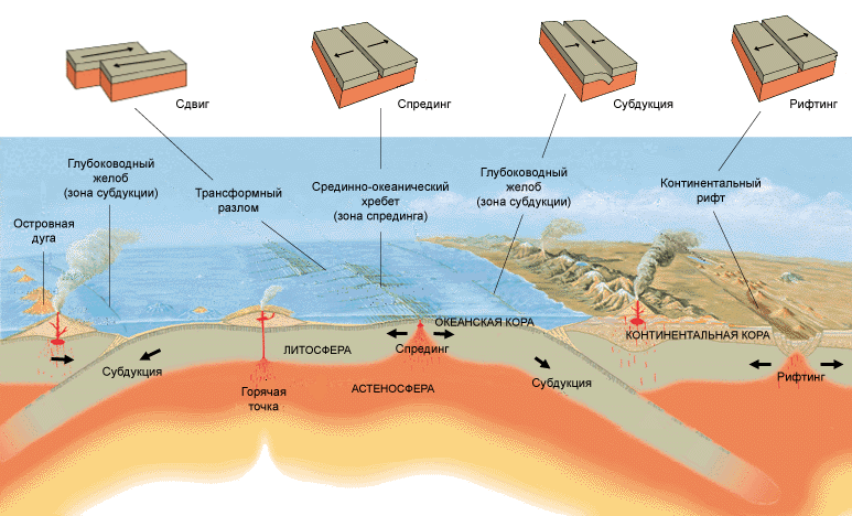 В местах, где тектонические плиты соприкасаются друг с другом, расположены зоны максимальной вулканической и сейсмической активности: во время движения и столкновения литосферы, земная кора разрушается, а когда они расходятся, образуются разломы и впадины (литосфера и рельеф Земли связаны друг с другом). Это является причиной того, что вдоль краёв тектонических плит расположены наиболее крупные формы рельефа Земли – горные хребты с активными вулканами и глубоководные желоба.
