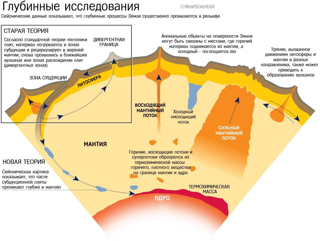 Однако есть исключения – так называемые горячие точки, которые могут существовать и в глубине литосферных плит. В них расплавленные потоки вещества астеносферы прорываются наверх, проплавляя литосферу, что приводит к повышенной вулканической активности и регулярным землетрясениям. Чаще всего это происходит неподалеку от тех мест, где одна литосферная плита наползает на другую – нижняя, вдавленная часть плиты погружается в мантию Земли, повышая тем самым давление магмы на верхнюю плиту. Однако сейчас ученые склоняются к той версии, что «утонувшие» части литосферы расплавляются, повышая давление в глубинах мантии и создавая тем самым восходящие потоки. Так можно объяснить аномальную отдаленность некоторых горячих точек от тектонических разломов.