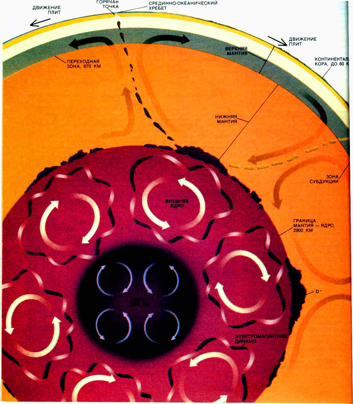 Ядро сменяется мантией, которая простирается почти на 3000 км (83 % объема Земли). Считают, что она твердая, в то же время пластичная и раскаленная. Мантия состоит из трех слоев: слоя Голицына, слоя Гуттенберга и субстрата. Верхняя часть мантии, называемая магмой, содержит слой с пониженной вязкостью, плотностью и твердостью — астеносферу, на которой уравновешиваются участки земной поверхности. Граница между мантией и ядром называется слоем Гуттенберга.