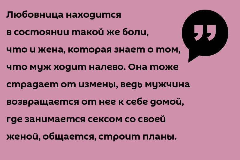 А это значит, что любовница ненавидит жену, ей больно, обидно, и она с нетерпением ждет, когда это все закончится в ее пользу. К тому же, мужчина подливает масла в огонь, говоря, какая она хорошая и как бы он ушел из семьи, если бы только мог.