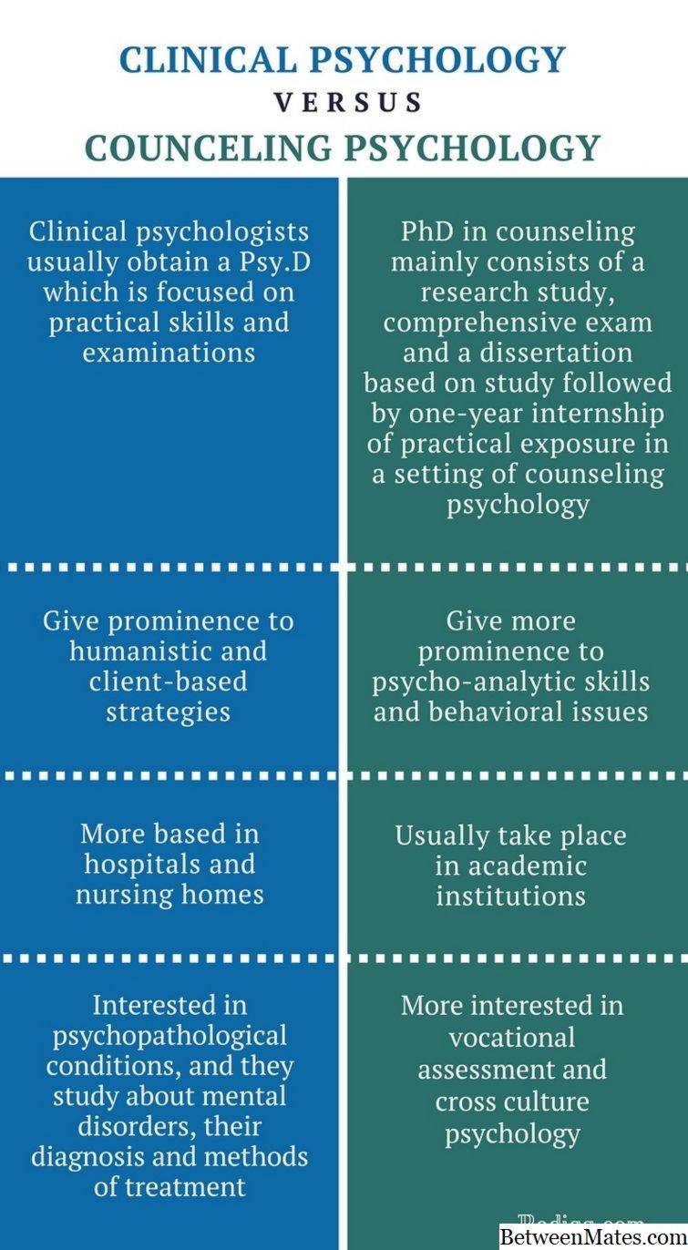 Клиническая психология против психологии консультирования Для не имеющих лицензии профессионалов, работающих в области психологии, клиническая и консультационная психология, возможно, не имеет какой-либо разницы в отношении лечения пациентов. Психолог – психолог, и они клинические и адвокаты, верно? Неправильно, есть много