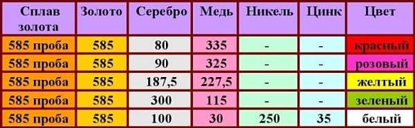 583 и 585 маркировки практически идентичны, в них содержится не более 59% чистого золота, все остальное приходиться на долю примесей — других элементов, которые меняют цвет и свойства лигатуры. В сплав могут быть добавлены как драгоценные элементы, так и металлы, которые благородством не отличаются, зато они делают лигатуру более прочной и подходящей для ювелирной промышленности.