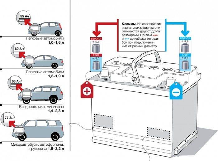 Не стоит покупать аккумулятор малой емкости; для стандартного легкового автомобиля без кондиционера и другого дополнительного электрооборудования аккумулятор должен быть не менее 55 ампер-часов. Если в электрической цепи много потребителей, можно приобрести аккумулятор на 60 Ач.