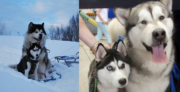 - ездовые качества (обе породы относятся к категории северных ездовых собак, которые были созданы, чтобы бежать в упряжке, единственным отличием является их тяжеловесность, маламут нерасторопен, но перевозит крупные грузы, а хаски быстроходен, но не сможет взять большое количество вещей);