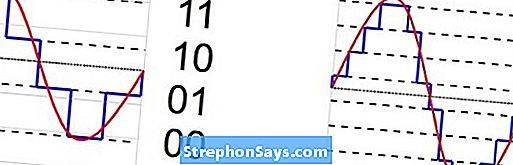 Преобразование непрерывного аналогового сигнала (красный) в дискретный цифровой сигнал (синий). Слева преобразование было выполнено с использованием 2 битов, таким образом создавая 4 различных уровня, которые мог бы принимать цифровой сигнал. Справа используются 3 бита. Следовательно, сигнал может быть представлен 8 различными уровнями. Этот сигнал имеет более высокое разрешение и «ближе» к исходному аналоговому сигналу.