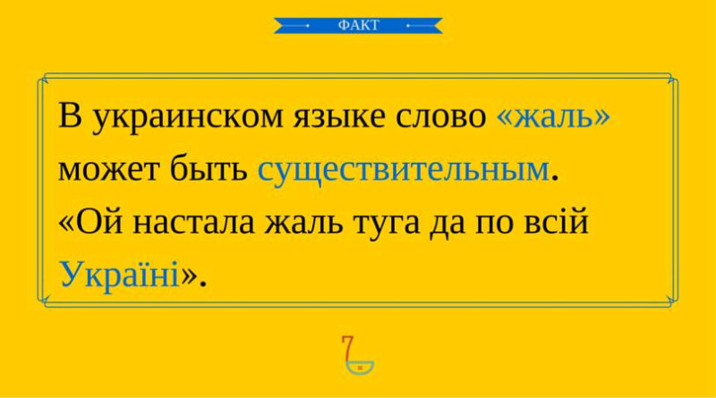 В украинском языке, употребляясь как наречие, слово «жаль» обладает подобным смыслом. Однако оно может быть также существительным, и тогда его смысловые оттенки заметно обогащаются, становясь созвучными таким словам как скорбь, горечь, боль. «Ой настала жаль туга да по всій Україні». В таком контексте данное слово в русском языке не используется.