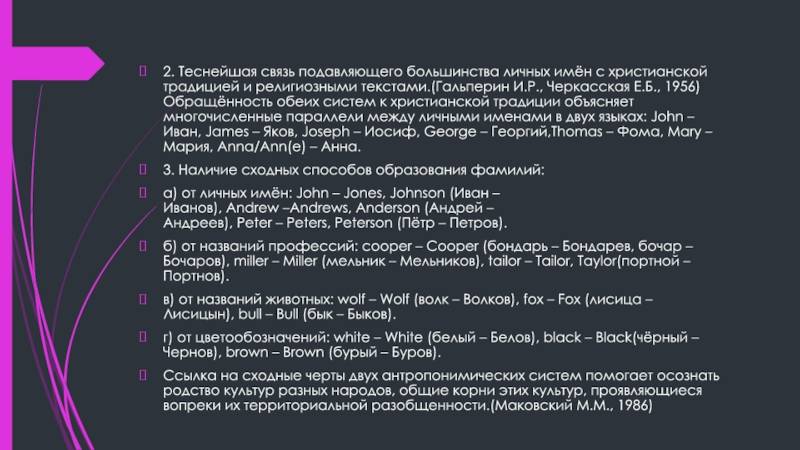 к христианской традиции объясняет многочисленные параллели между личными именами в двух языках: John – Иван, James – Яков, Joseph – Иосиф, George – Георгий,Thomas – Фома, Mary – Мария, Anna/Ann(e) – Анна.3. Наличие сходных способов образования фамилий:а) от личных имён: John – Jones, Johnson (Иван – Иванов), Andrew –Andrews, Anderson (Андрей – Андреев), Peter – Peters, Peterson (Пётр – Петров).б) от названий профессий: cooper – Cooper (бондарь – Бондарев, бочар – Бочаров), miller – Miller (мельник – Мельников), tailor – Tailor, Taylor(портной – Портнов).в) от названий животных: wolf – Wolf (волк – Волков), fox – Fox (лисица – Лисицын), bull – Bull (бык – Быков).г) от цветообозначений: white – White (белый – Белов), black – Black(чёрный – Чернов), brown – Brown (бурый – Буров).Ссылка на сходные черты двух антропонимических систем помогает осознать родство культур разных народов, общие корни этих культур, проявляющиеся вопреки их территориальной разобщенности.(Маковский М.М., 1986)