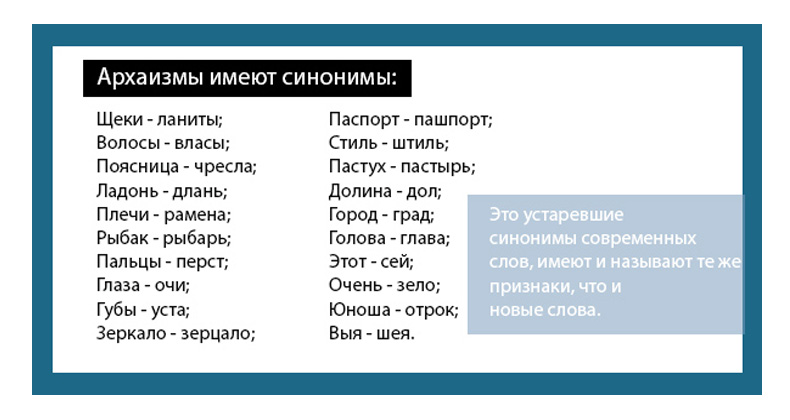 Архаизмы, в отличие от историзмов, в современном языке имеют синонимы. Слова и их значение выходят из употребления по разным причинам