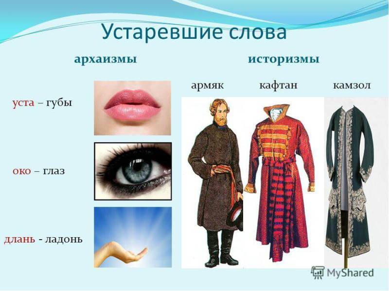 Для начала разберем устаревшие слова – архаизмы и историзмы. Архаизмы – устаревшие слова, в настоящий момент вышедшие из употребления. Это старые названия современных предметов или названий. Зачастую на смену архаизмам приходят другие слова, которые называют те же понятия и предметы, что и устаревшее слово. У каждого из них есть современный аналог, проще говоря, слово-синоним.