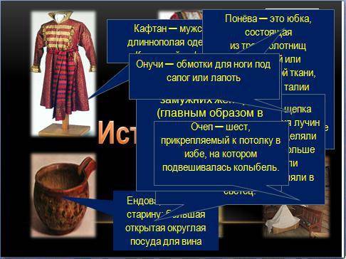 - стародавняя одежда и обувь – салоп, армяк, камзол, фижма, башмак, лапти;