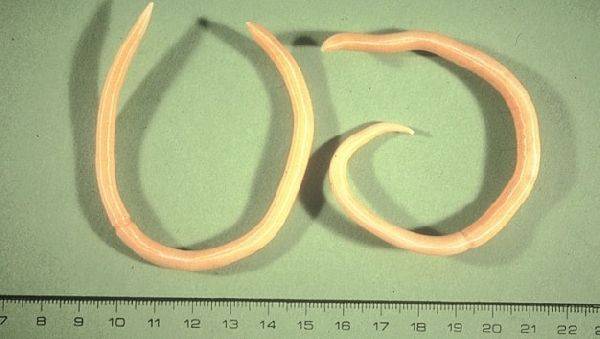 Вызывающие аскаридоз, называются аскаридами. Аскариды белого цвета. Одно из главных отличий от остриц – размер червей. Самки аскарид достигают длины, равной 40 см, самцы – 25.