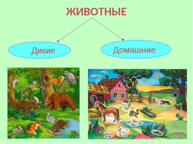 – Ребята, скажите на какие два вида, по месту проживания можно разделить животных? (дикие и домашние)