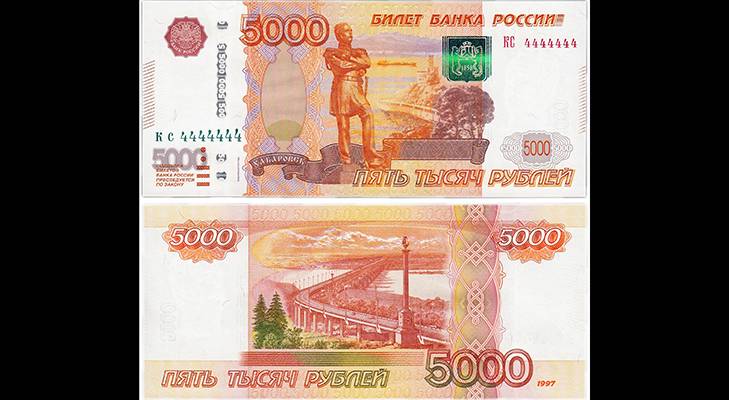 - Купюры номиналом 5000 рублей могут быть разного года изготовления. Купюра 5 000 1997 года, подлинность которой нужно определить, отличается от купюры 2010 года по внешнему виду. Но обе купюры являются действующими и настоящими. Слева изображена банкнота 1997 года, а справа 2010 года.