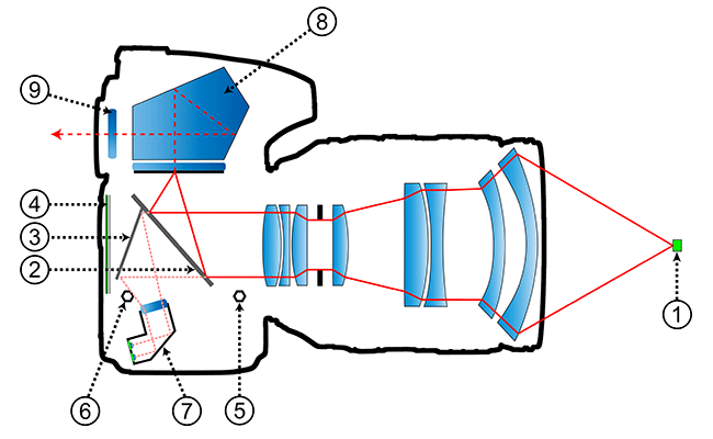 Классическим оптическим видоискателем, имеющим 98% покрытия кадра и поддерживающим 0,71-кратное увеличение;