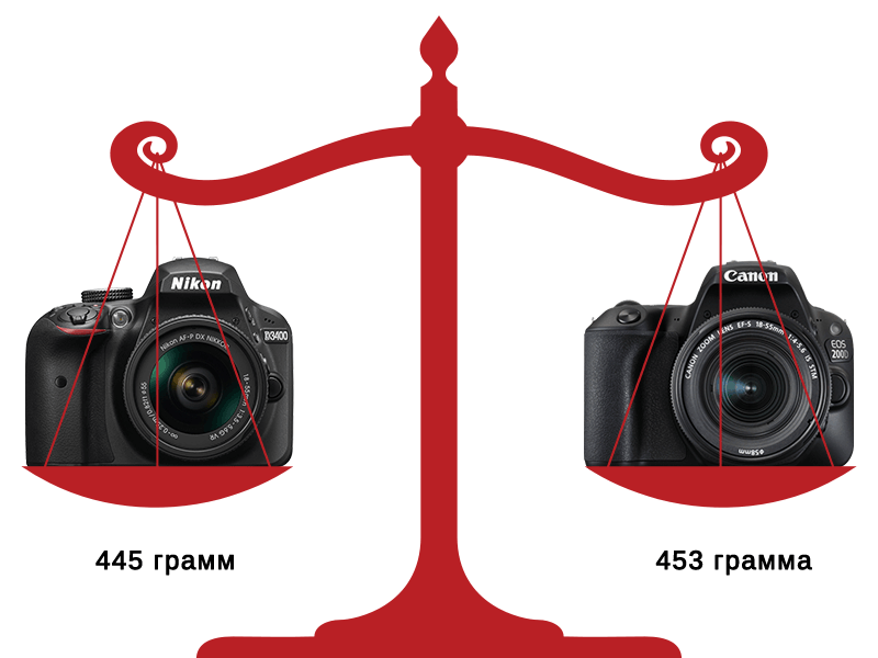 Начнем с размеров. Canon EOS 200D: 122х93х70 мм. против Nikon D3400 124х98х76 мм. Первый меньше на 2-6 миллиметров по всем габаритам. Зато Nikon d3400 легче Canon EOS 200D на 8 грамм, 445 г, против 453Г. Полный паритет, только у Nikon в пластике корпуса присутствуют кевларовые волокна, что однозначно делает корпус крепче.