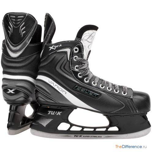 созданы для командной игры, и главное требование к ним – это защита ноги. Попадание шайбы, удары клюшкой, столкновения – все это должно быть безопасно для игрока. Поэтому материал, из которого изготавливаются ботинки, более прочный и ударостойкий, чем кожа. Это может быть нубук, термопласт, нейлон. Ботинок обычно выбирается на полразмера больше, чтобы нога чувствовала себя свободно при резких ускорениях, которых в хоккее довольно много. Лезвия хоккейных коньков производятся из сплава стали с никелем, либо же с хромом. Но существуют лезвия и из нержавеющей стали, у которой должна быть высокая степень закалки. При этом они в любом случае не должны быть длиннее ботинка.