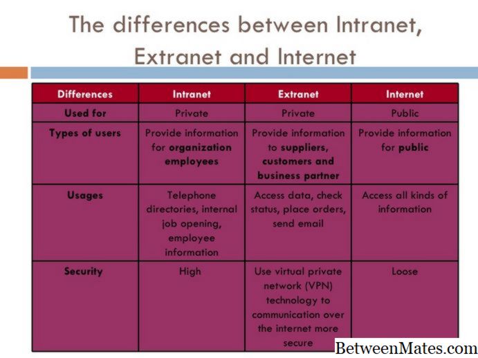 Интернет, экстрасети и интрасети используют одни и те же технологии TCP / IP. Однако они различаются с точки зрения уровней доступа, которые они предоставляют различным пользователям внутри и вне организации, и размера сети. Интранет допускает ограниченный доступ только для членов организации; Экстранет расширяет этот доступ, позволяя сторонним организациям, таким как поставщики и клиенты, использовать ресурсы компании. Разница между Интернетом и экстрасетями заключается в том, что, хотя экстранет предоставляет ограниченный доступ лицам, не являющимся членами организации, Интернет, как правило, позволяет каждому получить доступ ко всем сетевым ресурсам.