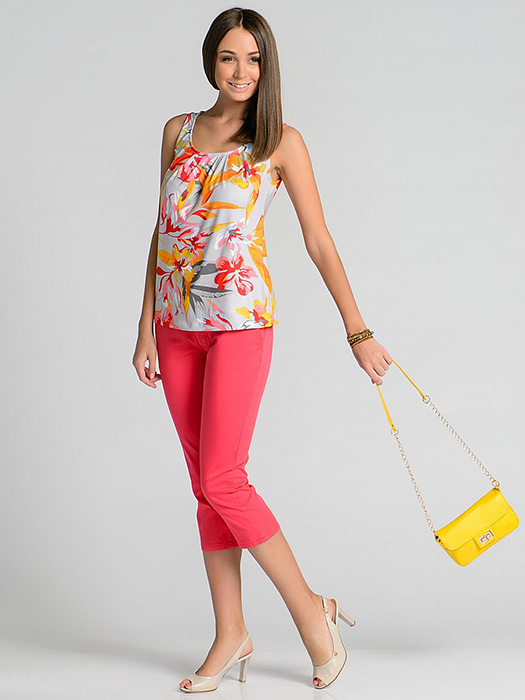 Для составления чудесного летнего лука в классическом стиле применяются белые бриджи с боковыми разрезами, которые отлично комбинируются с вещами любых оттенков. Не менее популярны яркие летние изделия желтого, зеленого, голубого, бирюзового, бежевого оттенка. Романтично смотрятся образцы с леопардовым принтом, мелким рисунком, узорами, абстракциями, в клетку или горошек.