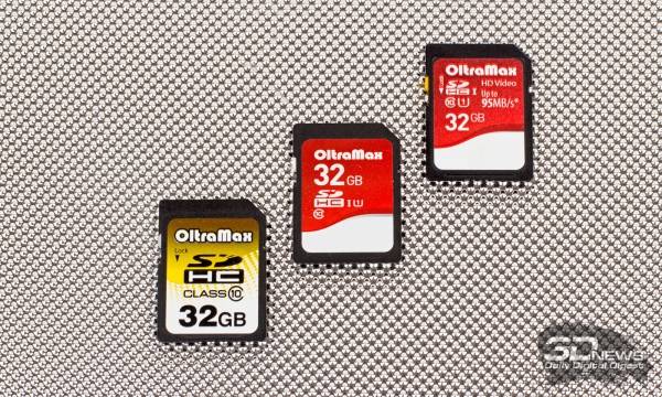 Трио OltraMax почти ничем не отличается от предыдущих троек. Самая простая и дешёвая карта от этого производителя, OltraMax OM032GSDHC10, обозначена только 10-м классом, средняя карта памяти, OltraMax OM032GSDHC10UHS-1, тоже не может похвастать какими-либо отметками, кроме 10-го класса и UHS-I. Зато самая крутая карта, OltraMax OM032GSDHC10UHS-1 95 MB/s*, обещает скорость около 95 Мбайт/с, что очень интересно.