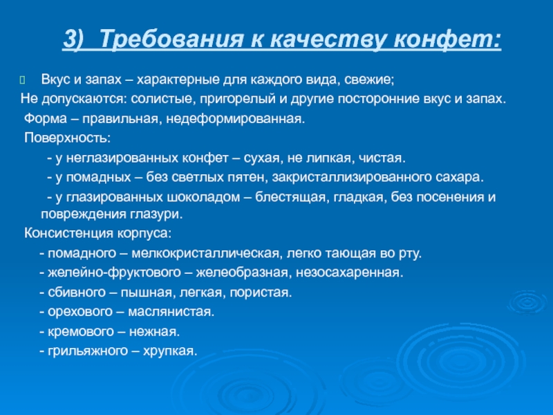 Слайд 163) Требования к качеству конфет:Вкус и запах – характерные для каждого