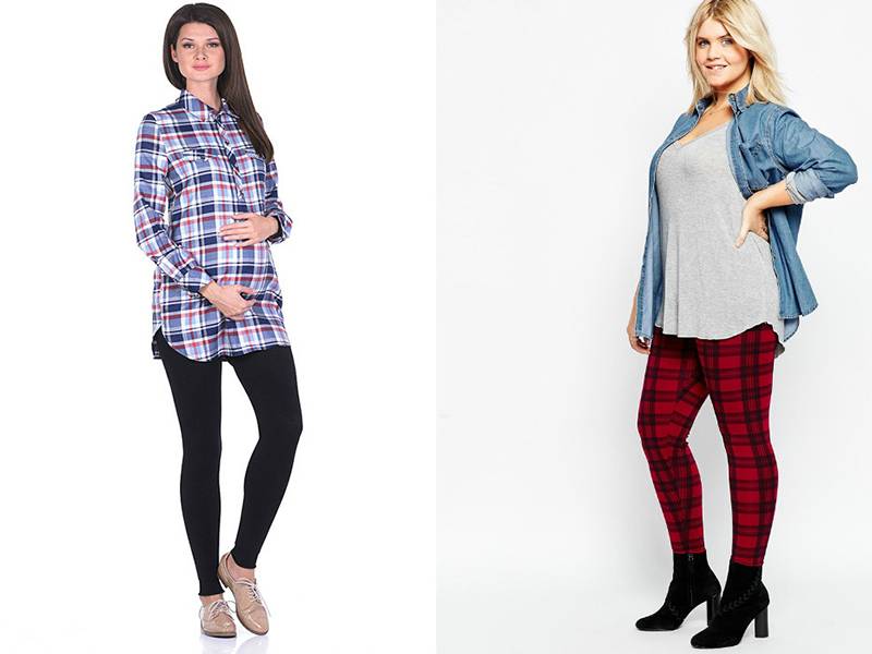 - Летом широко используются трикотажные легинсы и хлопковая рубашка в клетку или с глубоким вырезом и короткими рукавами.