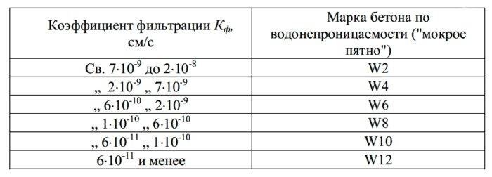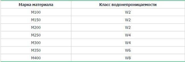 | Марка бетона | Класс бетона | Водонепроницаемость (W) |