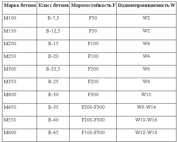 Марки бетона и другие характеристики, можно посмотреть в таблице. В ней, кроме М с цифровым индексом, есть соотнесение с классом, морозостойкостью и водонепроницаемостью: