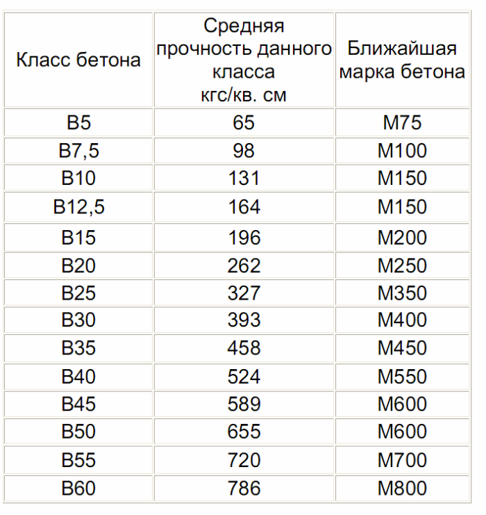 Марка напрямую зависит от класса бетона по прочности на сжатие, что подтверждает приведенная ниже таблица:
