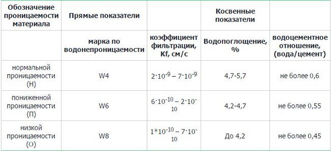 W2, W4 — для внутренних работ, W10-W20 — для гидротехнических конструкций повышенной сложности. Иногда в маркировке участвуют буквы Н, П и О — нормальная, пониженная и низкая проницаемость. Марке по водонепроницаемости соответствуют косвенные показатели — коэффициент фильтрации, водопоглощение и соотношение воды и цемента. W2 — это марки М100-200, W4 — М250-300. Дальнейшую расшифровку можно найти в специальных источниках — справочниках, таблицах, нормативных документах.