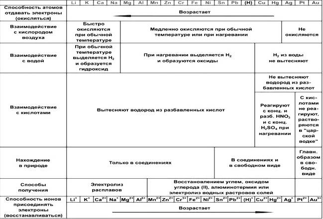 Способность металлов отдавать электроны зависит от размера атомного радиуса, а также от электроотрицательности. Чем больше атомный радиус (расстояние от центра ядра), тем легче атому отдавать электроны. С увеличением электроотрицательности (способности атома оттягивать на себя электроны от другого атома) уменьшаются металлические (восстановительные, основные) свойства.