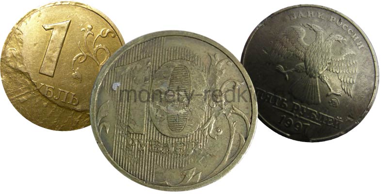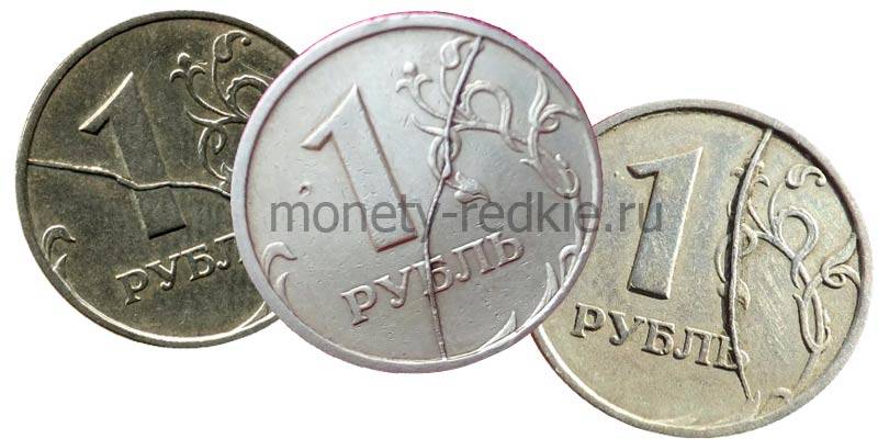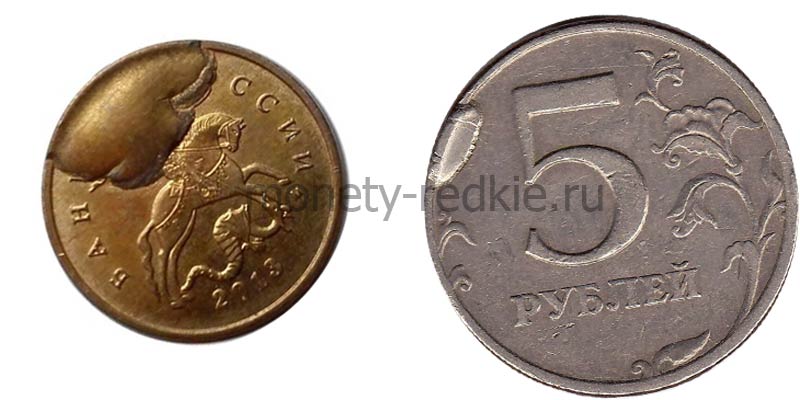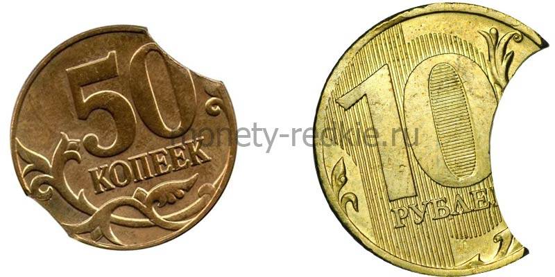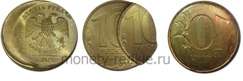 Малоценными, но все же явно дороже своего номинала будут стоить монетки с такими браками, как раскол штемпеля, выкрошка или загрязнение штемпеля, нарушение соосности, выкус, значительный непрочекан. Цена таких браков начинается от 50 руб., а если брак серьезно выражен или сочетается, то стоимость может выйти более 1000 руб. Примеры на фото: