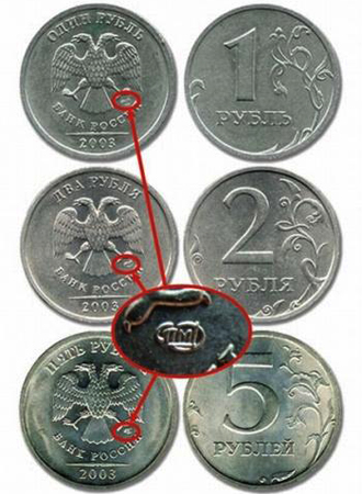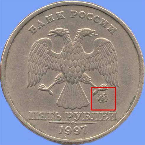 Если посмотреть на аверс монеты номиналом 10, 5, 2 и 1 рубль, то под левой лапой орла будет знак СПМД или ММД.